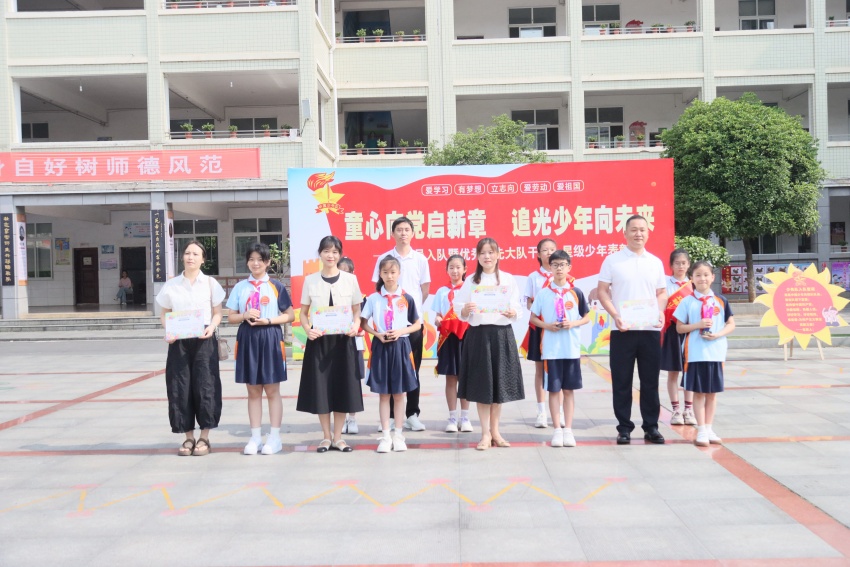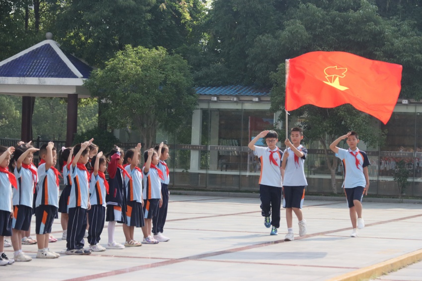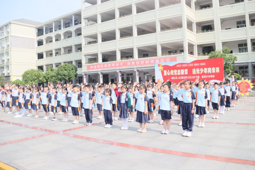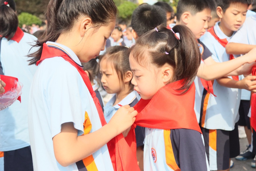 上午8:30,启智广场队旗飘扬,128名新队员在全校师生见证下迎来成长中的重要时刻。伴随《中国少年先锋队队歌》的激昂旋律,老队员为新队员佩戴红领巾,鲜艳的红色映衬着少年们的坚毅目光。在大队长宗泽乾的带领下,全体队员高举右拳庄严宣誓:“准备着,为共产主义事业贡献力量!”铿锵誓言响彻校园,传递着红色基因代代传承的信念。
