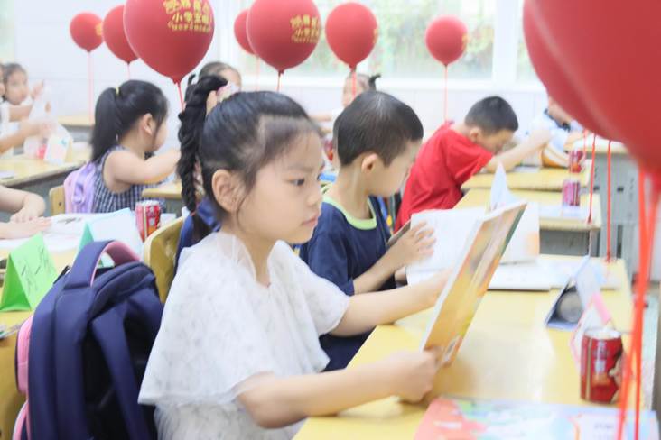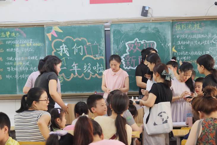 在班主任精心装扮的教室里,老师和家长、同学们进行亲切的交流,虽人头攒动,但现场各项工作依然有序进行,有条不紊。孩子们迅速找到自己的好朋友,说着悄悄话,有的兴高采烈的分享着假期趣闻,一个个喜笑颜开;有的帮老师收作业、发新书、打扫卫生,忙得不亦乐乎;有的赶紧把领到的新书用漂亮的书皮包起来,生怕把新书弄坏了;有的迫不及待的翻开新书,静静的享受着书本里的新知识;有的展示着假期实践作业和变废为宝手工作品,自豪之情溢于言表……
