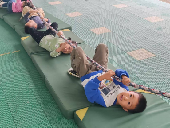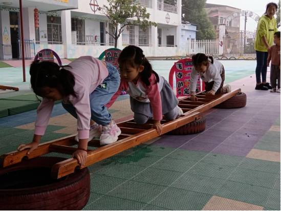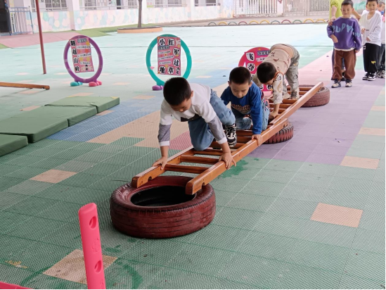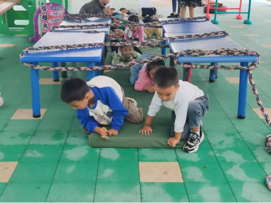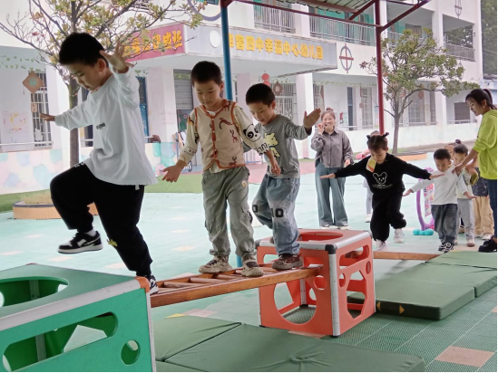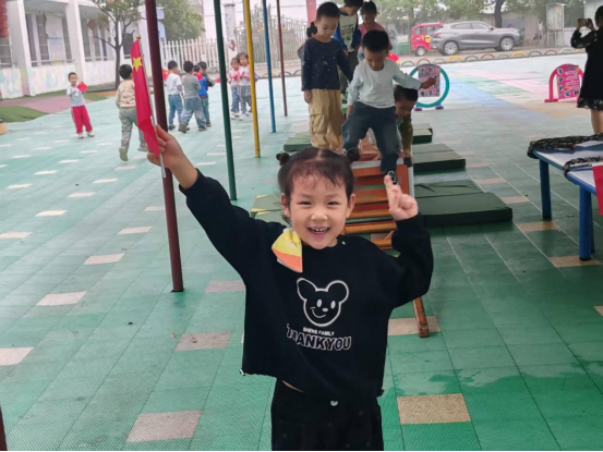 9月26日上午,老师们将操场打造成了充满红色氛围的“长征路线”。在“飞夺泸定桥”环节,孩子们手抓绳索、脚踩平衡木,小心翼翼地“跨越天险”,眼神中满是专注与坚定;“翻山岭”关卡里,他们手脚并用攀爬山坡,体验着红军战士翻山越岭的艰辛;“过草地”时,孩子们踩着绿色地垫,避开地上的“陷阱”,在模拟的沼泽场景中学会互相搀扶;“穿越火线”环节最是热闹,孩子们弯腰低头钻过悬挂的彩绳,仿佛化身小小战士突破敌人封锁线,每成功闯过一关,拿到一面小红旗,脸上都会绽放出自豪的笑容。