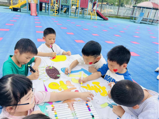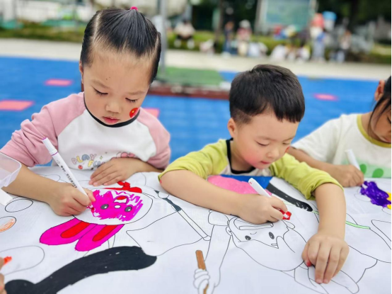 最引人注目的是“童心赞祖国,小手绘长卷”环节。操场中央铺开长长的画布,大班孩子们手持画笔,以“中秋团圆、祖国美好”为主题自由创作,孩子们你一笔我一画,原本空白的长卷渐渐变得色彩斑斓,成为幼儿园里最亮眼的“双节答卷”。
