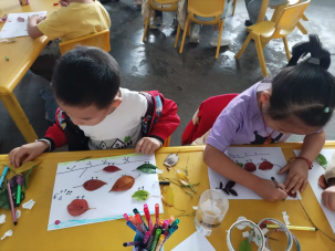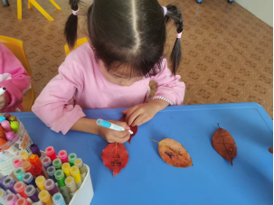 绘本阅读结束后,“树叶书签制作” 环节让孩子们化身 “小小创作家”。幼儿园提前组织孩子们在户外捡拾形态各异的落叶,教师为孩子们准备了剪刀、胶水、彩绳、彩笔等工具,引导大家发挥想象,对树叶进行修剪、装饰。孩子们专注地剪裁、粘贴,一双双小手灵动翻飞,原本普通的落叶在他们手中变成了独一无二的精美书签。