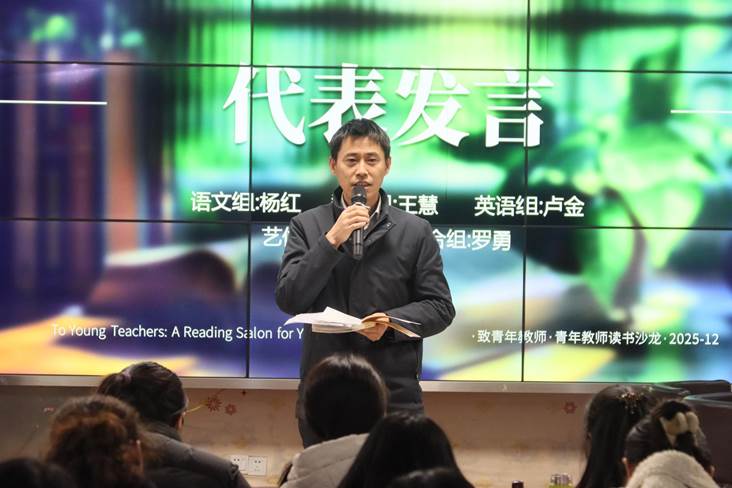 学校负责人代表综合组结合自身教学案例分享了讨论成果,并作了“以心灵照亮心灵 以专业奠基未来”为主题的阅读分享。他指出,教育的真谛,在于以心灵唤醒心灵。正如《致青年教师》所启示,教师需心怀热忱,做学生成长路上的“点灯人”——以扎实专业素养筑牢教学根基,用耐心与尊重呵护学生个性,在日常点滴中培养良好习惯,于琐碎工作中坚守教育理想。他希望每一位教师都能把阅读当作精神充电站,在生活中汲取这份力量,展现精气神,以不灭的热情照亮学生前路,用真诚与专业,书写属于自己的教育篇章。