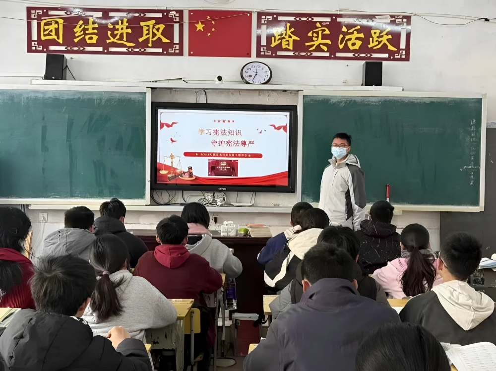 12月4日,学校特邀县人民检察院来校举办“法安青春,德润心田”宪法专题讲座。县检察院第六检察部副主任胡高结合学生实际,围绕“法治与道德相辅相成”展开讲解。讲座通过“递刀担责”“早恋引发刑案”等真实案例剖析,引导学生明确法律底线;分享“性侵防范四步法”“远离毒品六不一要”等实用知识,帮助学生提升自我保护能力;并融入感动中国人物事迹与传统文化经典,鼓励学生树立正确价值观,做到法德兼修、知行合一。现场气氛严肃而活跃,学生认真聆听、积极思考,进一步理解了宪法的意义与法治的精神。
