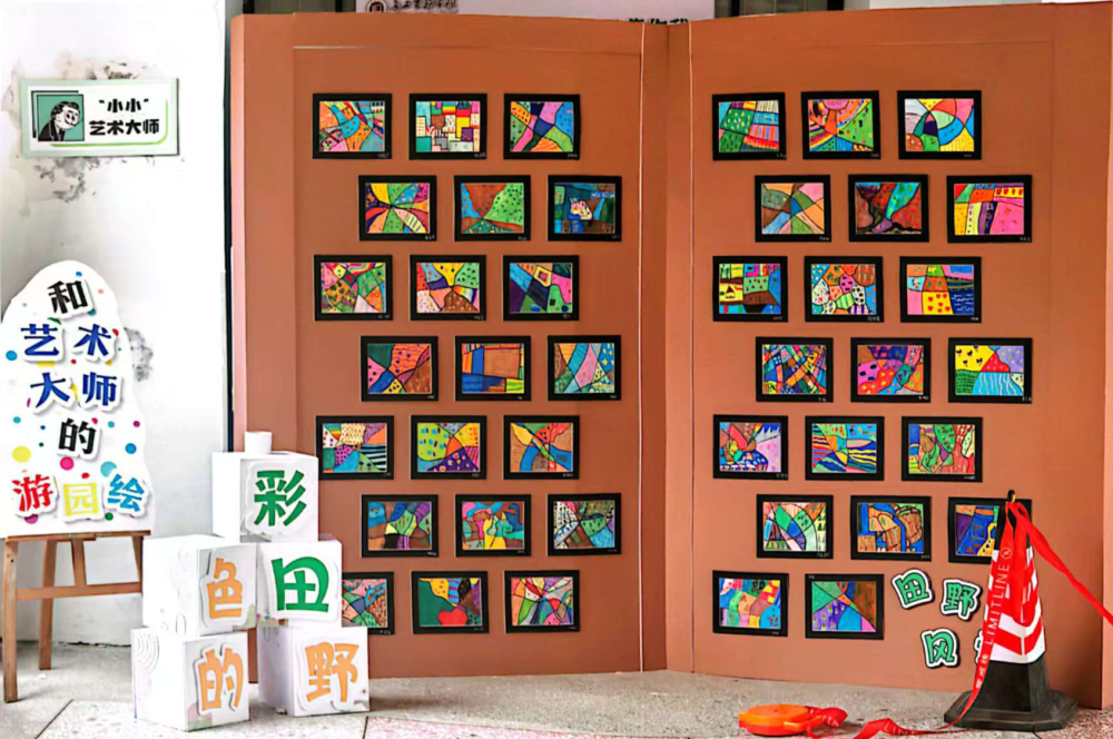 第二天清晨,天尚未全亮,王娅妮老师已赶到长廊。李斯主任更早到场,正默默修补被夜风雨吹歪的展板。他们一同轻轻揭开保护膜,“艺术大师的游园会”静静地等待着它的第一批观众。