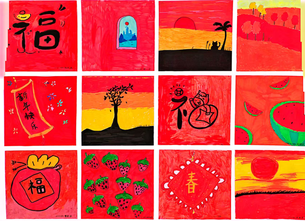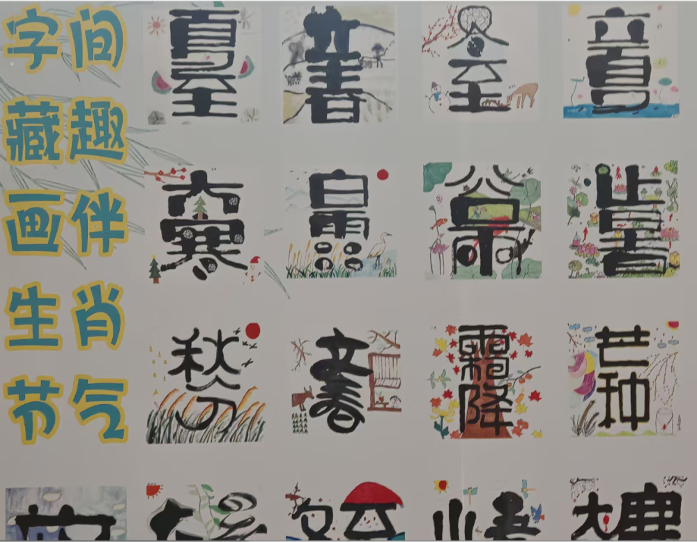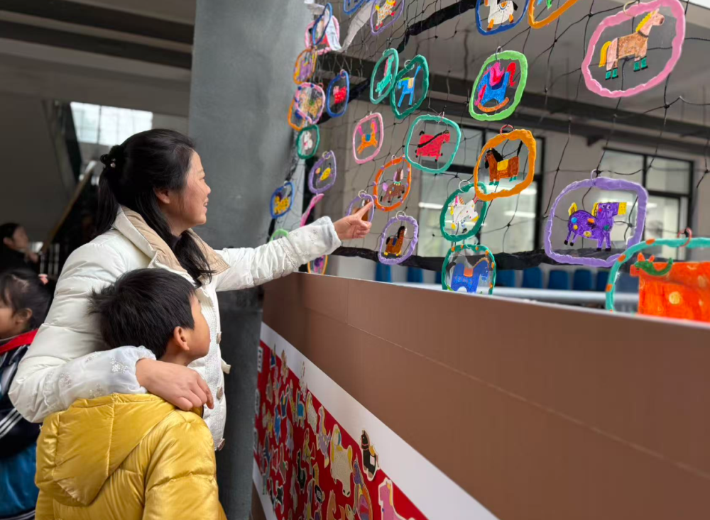 放学时分,长廊变成了热闹的天地。家长们陆续到来,惊叹声、欢笑声此起彼伏。“这都是孩子们画的吗?平常在家画,不觉得……”一位家长的话道出了许多人的惊喜。孩子们兴奋地牵着家人的手,在自己的作品前雀跃解说。饶成熙指着画上的甲骨文“羊”字告诉爸爸:“羊在草地上吃草呢!”王一诺自豪地解释自己的“千金一诺”:“因为我是女孩,也寓意一言千金!”汤雅琪轻声细语地说:“我的是‘清雅若玉’,妈妈希望我有如玉的品质。”一位爷爷端详着色彩强烈的抽象画,乐呵呵地说:“这黄的蓝的红的凑一起,还怪好看的!”身边的小孙女立刻当起解说员:“爷爷,这是老师教我们跟蒙德里安大师学的!”