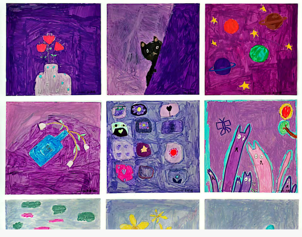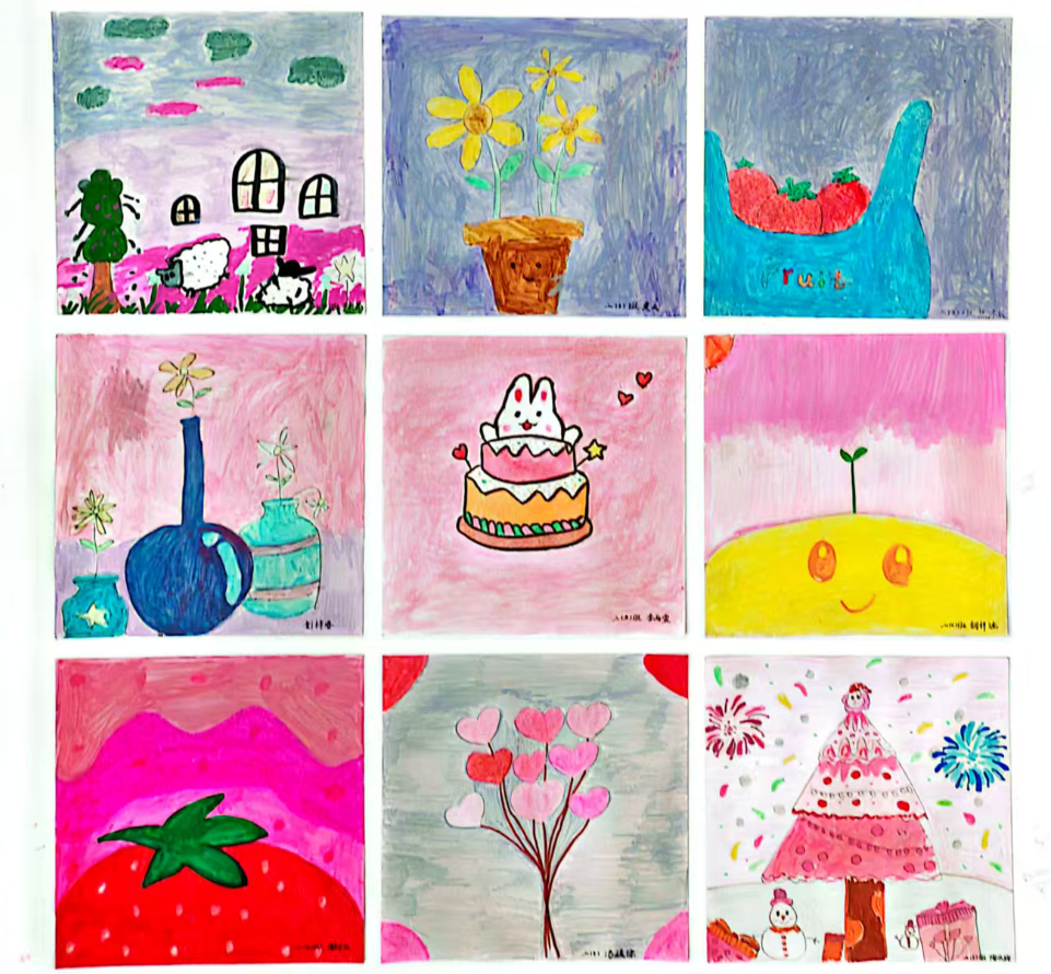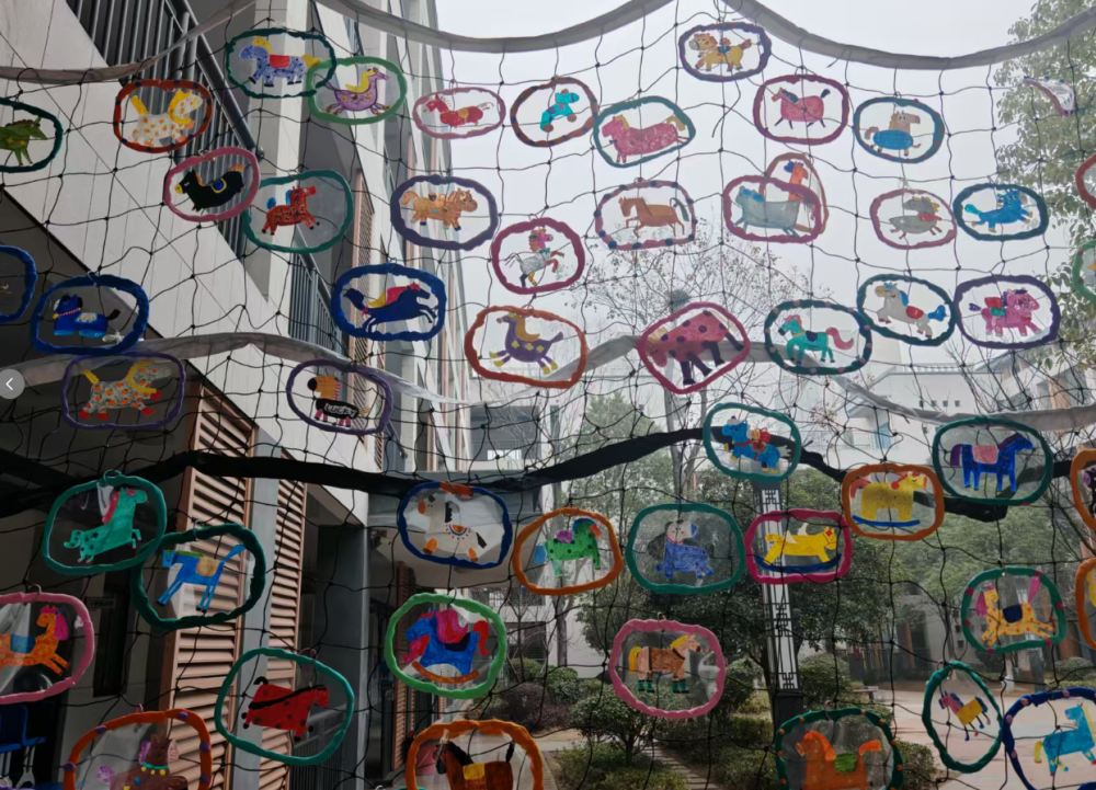 画展的前一天,风雨交加。一级部的任文、谈娟、王娅妮三位老师已在空旷的长廊里忙碌着布展。冷风刺骨,她们不时停下,朝冻僵的双手哈几口热气,又继续俯身工作。眼见雨点渐密,小学部李斯主任匆匆出门购回防雨薄膜,细心地将一幅幅稚嫩的作品遮盖妥当,生怕风雨沁湿了孩子们的心血。成思慧和陈洁主任则穿梭补给物资,让整个布展过程从容不迫。天色渐暗,任文老师仍在彩泥小房子前细致调节展板高低;谈娟老师俯身整理着上百幅五颜六色的方块画——那是孩子们笔下的梦想建筑;王娅妮老师一边轻柔地固定画作,一边感叹:“真舍不得多戳一个图钉,怕破坏了这份诗意。”面对以二十四节气为主题的国画作品,她欣喜地说:“在智能时代,孩子们能主动探索传统文化,笔触还能如此拙朴天真,这份原生的创造力最值得我们珍视。”