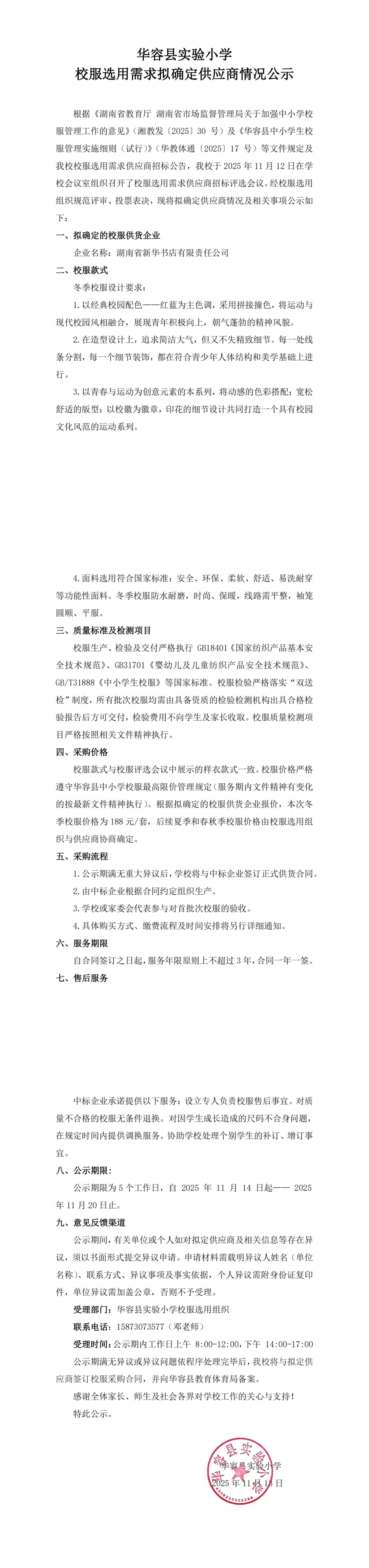 华容县实验小学校服选用需求拟确定供应商情况公示