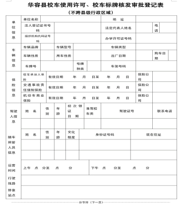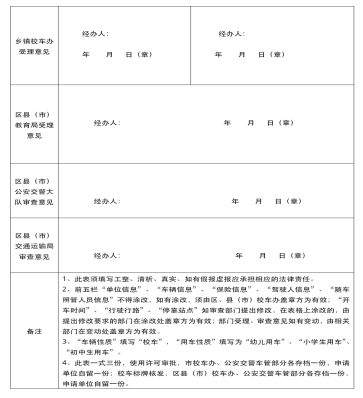新增校车许可:经校车服务单位初审同意新增专用校车服务的学校、幼儿园需向县校车办提交书面申请报告,注明拟购车辆核载座位数,附上《岳阳市新购校车上户和校车过户审批表》、办学资质、乘车学生实名台账、拟驾驶人资质、拟行驶线路等相关资料,由乡镇中学分管校车安全工作副校长及校车服务单位根据辖区现有校车运力、现有校车行驶线路等情况初审并签章,报乡镇、街道人民政府同意后送县校车办。经县教体局、县交通局、县交警大队审查统一后,报县校车安全管理工作领导小组审批。县校车安全管理工作领导小组审批后,按规定办理校车使用标牌。 因校车服务单位、校车行驶线路、开行时间、停靠站点或者车辆、所有人、驾驶人发生变化的校车使用许可:由各校车公司(服务学校)负责收集整理好相关资料办理。资料内容: (一)车辆符合校车安全国家标准,取得机动车检验合格证明,并已经在公安机关交通管理部门办理注册登记; (二)有取得校车驾驶资格的驾驶人; (三)有包括行驶线路、开行时间和停靠站点的合理可行的校车运行方案; (四)有健全的安全管理制度; (五)已经投保机动车承运人责任保险。 |