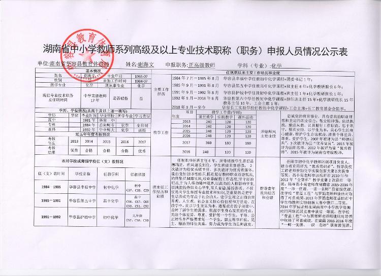 根据相关文件精神,通过个人申报、学校推荐、县综合考核,县教育体育局组织专家评委于11月28日至29日对参评对象谢海文老师的“教师职业道德”、课堂“教学能力和水平”、“民主测评”及材料真实性等方面,通过现场听课、测评、问卷、座谈、走访师生和家长、查阅相关档案资料等方式进行了实地考核,符合中小学正高级教师职务申报条件,拟将谢海文教师确定为2018年华容县中小学教师正高级职称推荐人选(具体情况见公示表),现予公示。