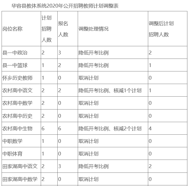 关于调整华容县教体系统2020年公开招聘教师部分岗位计划数的公告