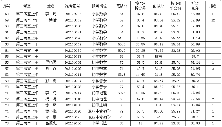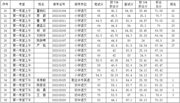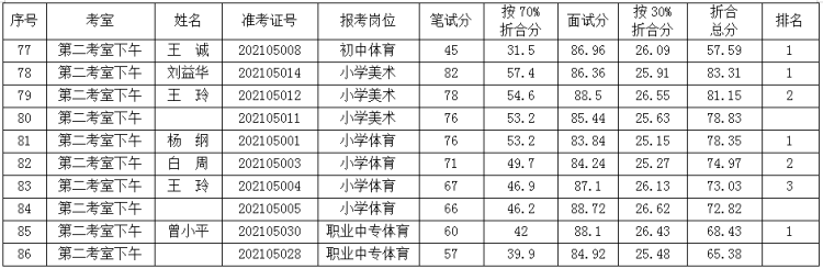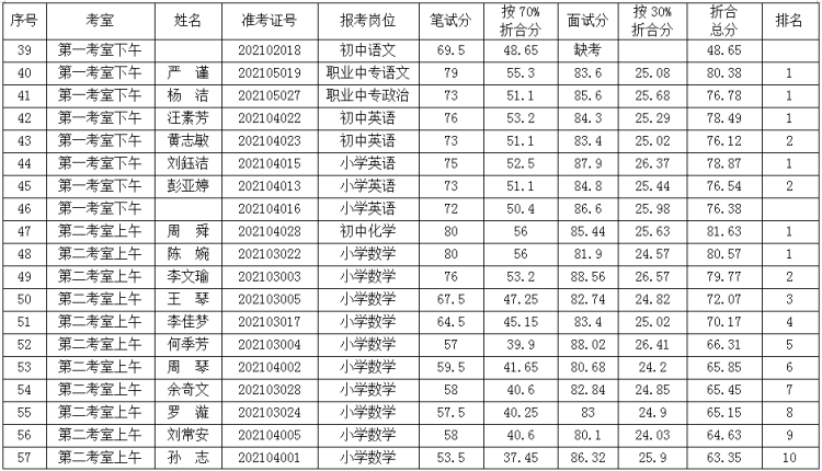根据《华容县教育体育局2021年城区学校公开招聘教师公告》精神,在县纪委监委派驻教体局纪监组的监督下,2021年城区学校公开招聘教师面试工作已于8月27日顺利结束,现将总成绩公示如下: