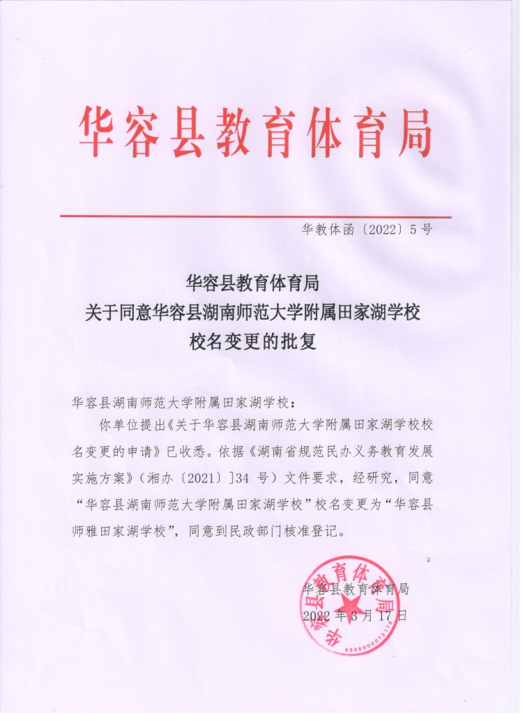 关于同意华容县湖南师范大学附属田家湖学校校名变更的批复