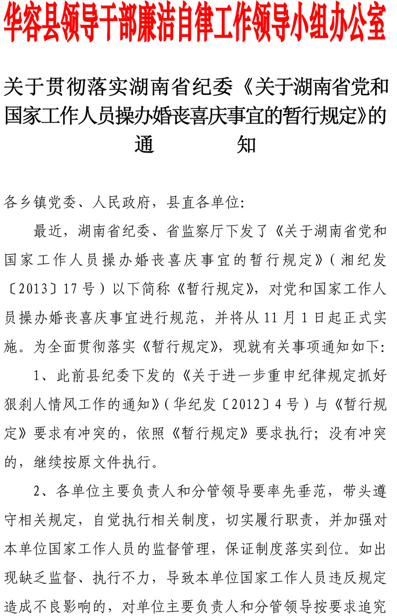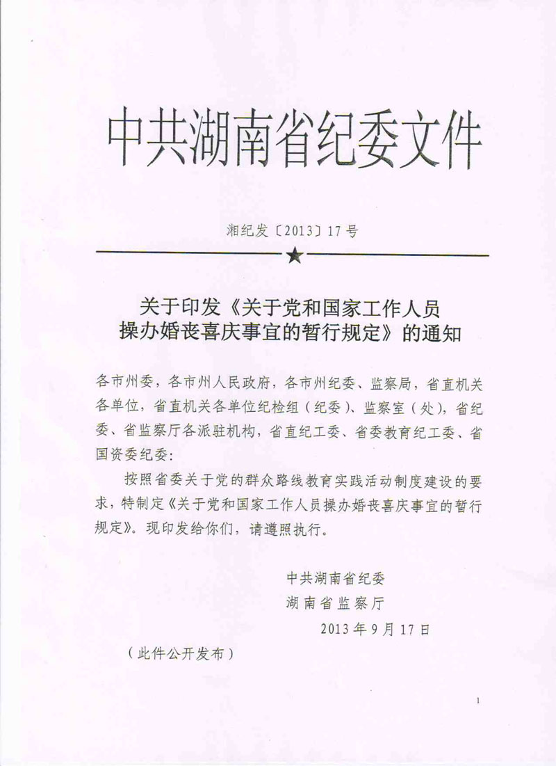 关于贯彻落实湖南省纪委《关于湖南省党和国家工作人员操办婚丧喜庆事宜的暂行规定》的通知