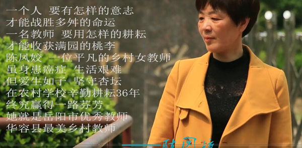 一个人,要有怎样的意志,才能战胜多舛的命运;一名教师,要用怎样的耕耘,才能收获满园的桃李?陈凤姣,一位平凡的乡村女教师,虽身患癌症,生活艰难,但爱生如子,坚守杏坛,终究赢得一路芬芳。她36年的教师生涯,当了36年班主任,连续14年任教初三语文,连续15年主动担任学校寝室管理员、女生辅导员,多次荣获市县“优秀班主任”、“优秀教师”、“教学质量先进个人”等殊荣,2015年被评为“华容县最美乡村教师”。