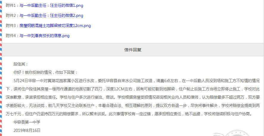 尊敬的陶县长: 你好! 我今天第四次向您求助:华容一中切断我房屋的钢筋混凝土地脚梁,既不同意给我维修,又不合理补偿。 我于8月8日,曾向您写了第一封求助信,华容一中于8月11日,将赔偿金和慰问金提高到27000元,我明确回复不同意,要求华容一中迅速在下述二个维修方案中二选一:A.一中维修;B.补偿4万元给我维修。但华容一中耍无赖,不理我。 8月27日,我向您写了第二封求助信,华容一中没有和我沟通,在回复时限到时进行了回复,说是:“积极主动处理好业主的诉求事宜,力争使事情得到圆满解决。”但实际情况是从8月11日我明确拒绝华容一中的方案后,华容一中非常无赖地不理我。 9月4日,我非常无奈地给您写了第三封求助信,继续重申我的上述主张。这次华容一中与我进行了联系:9月5日,华容一中的法律顾问——章华镇司法所唐泽亮所长电话联系了我,希望我降低补偿诉求,从而解决问题。我同意一中补偿35000元或一中维修,唐表示将和华容一中协商。昨天(信件最后回复时限),华容一中在网上进行了回复,说是:“确认该施工情况对您房屋不会造成损害。请您支持理解。”——华容一中第一封信还回复说:“学校将赔偿金提高到两万七千元,但住户仍坚持四万元的赔偿要求,所以暂未谈妥。此次事情学校有一定过错,愿承担相应责任,绝不逃避,学校将继续积极与住户协商。”——这次态度居然倒退了,这不是耍无赖是什么? 第四次重申我的主张,请县长做主:责令华容县一中1.迅速支付给我老婆的精神损失费2000元;2.迅速在下述二个维修方案中二选一:A.一中维修;B.补偿3.5万元给我维修。 致 礼! 段佳其 2019/9/17 |