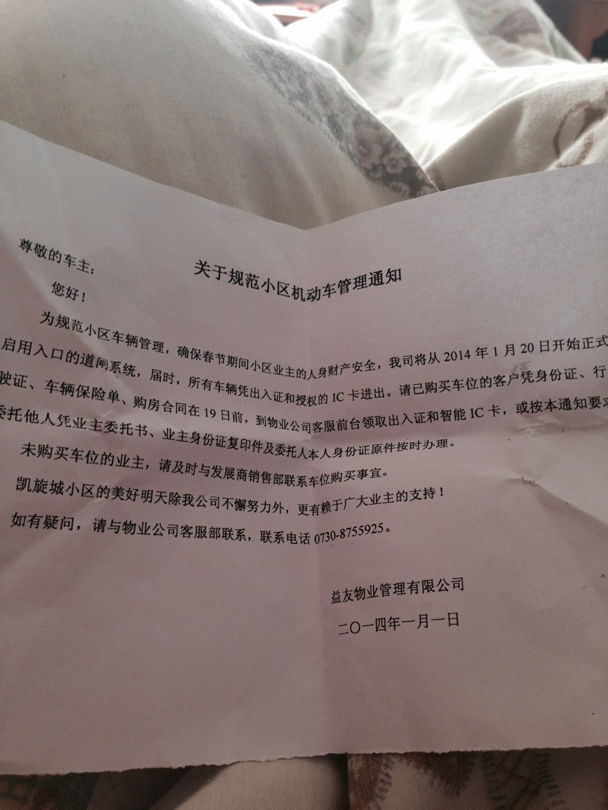 尊敬的领导: 我是城东昌友凯旋城一期的业主,謹以此函表示对凯旋城的一些意见,希望尽快回复。 1.关于房产证:凯旋城从2010年10月第一期开盘至今已足足有三年多时间,2012年6月开发商通知一期业主交房到现在也有一年多了,我们在2012年六月份收房时一次性交清了所有税费和维修基金等费用,但是快两年了,房产证到现在都没有踪影,开发商至今也没有任何解释! 2.关于停车位:开发商利用地下人防工程划设了1300多个地下停车位,只卖不租且价格高至8-12万一个。请问这种车位可以出售吗?有产权证吗?我们业主一致抵制售卖车位的行为! 3.关于停车收费问题:因买者少里面停车也不多,平时都不收费。现在在春节临近时突然以一纸通知表示要收取费用,而且该费用是12小时内10元,24小时内是20元,月租金是500元,比沿海发达地区还贵一倍!我现在深圳住的小区月租费才100元,稍微高档的小区业主月租费也就200差不多了。收一定的管理费用无可厚非,但是如此收费是不是直接拒绝没有购买车位的业主停车?询问物业公司他们收费的凭据,他们回答没有物价局的文件! 2.关于业主出入的门禁卡:每一户只配备一张通行卡,如果要再补办就要收50元一张,请问一个家庭只有一个人出入吗?他们的收费有物价局的批复文件没有? 凯旋城业主 附件1:IMG_8785_x.jpg |