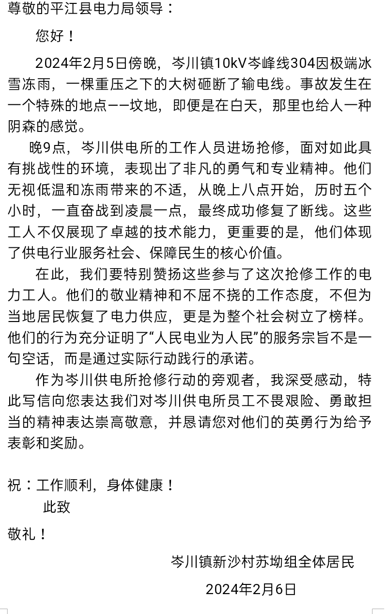 尊敬的网友,您好!您关于《感谢岑川供电所急民之所急冒风顶雪抢修电力设备》的留言收悉。平江县人民政府立即转交供电公司调查处理,现就有关办理情况回复如下: