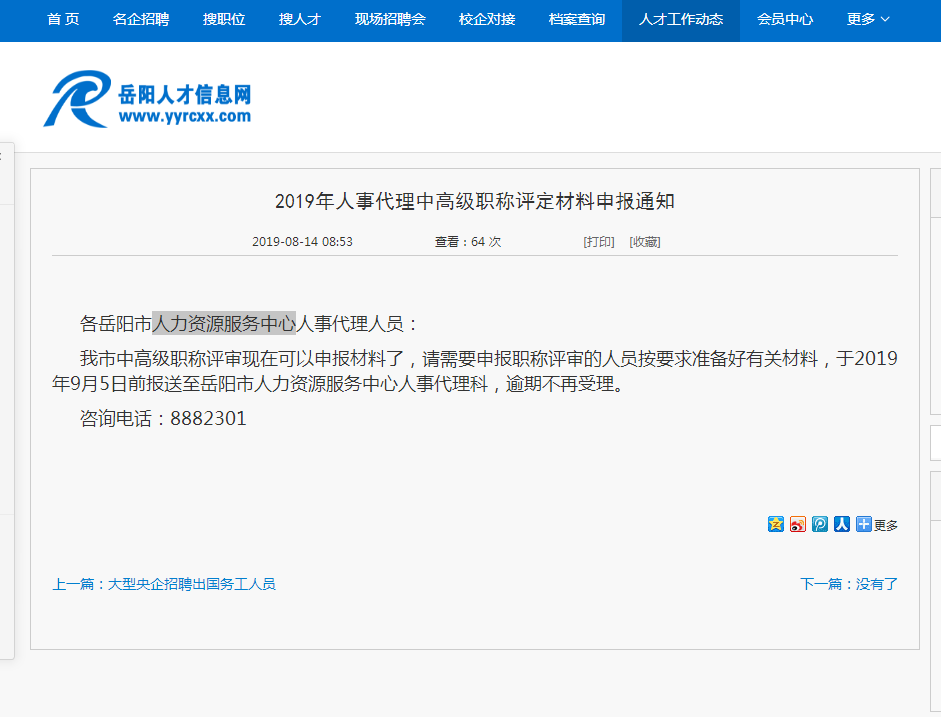 | 标题: | 关于岳阳市的2019年人事代理中高级职称评定的问题 |