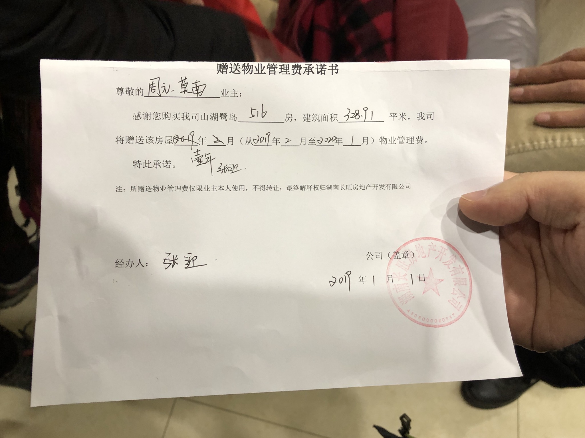 有关部门领导: 您好! 2018年5月为在湘阴县金龙镇(原街头铺镇)长旺房地产开发有限公司楼盘“山湖鹭岛”购买住房一套。该公司的物业公司-广州市悦禾物业管理有限公司岳阳分公司拒绝履行卖房时广告宣传的减免一年物业费承诺,强行逼迫住户缴纳第一年物业费,否则不予交房。按照与该公司约定,今天1月1号我们至物业办理收房手续,物业临时拒不履行承诺,玩文字游戏,强词夺理,把原宣传和承诺的“减免一年物业费”私自解释为:减免第二年物业费,第一年必须缴纳物业费否则不能收房。 今天收房时该公司售楼人员依然承认并开具了《赠送物业管理费承诺书》,承诺书上明确写明赠送2019年2月至2020年1月的物业管理费。但物业公司蛮横无理,声称与售楼部财务分开,物业费收取由物业公司说了算,第一年物业费必须缴纳否则别想收房。对于物业突然强行要求缴纳费用的举措该公司拿不出任何文字、图片证明材料,事先未告知任何业主,态度极其蛮横霸道,l f 附件1:6D99F139-64A5-4E0F-A642-D26F20A9A36A.jpeg |