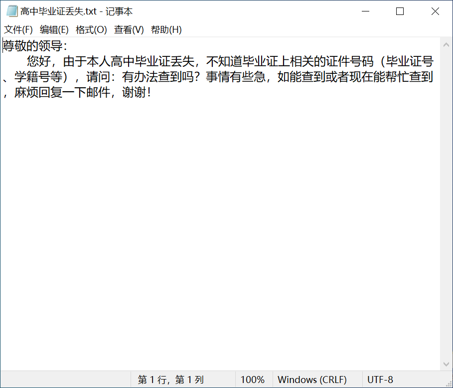 尊敬的领导: 您好,由于本人高中毕业证丢失,不知道毕业证上相关的证件号码(毕业证号、学籍号等),请问:有办法查到吗?事情有些急,如能查到或者现在能帮忙查到,麻烦回复一下邮件,谢谢! 附件1:高中毕业证丢失.png |