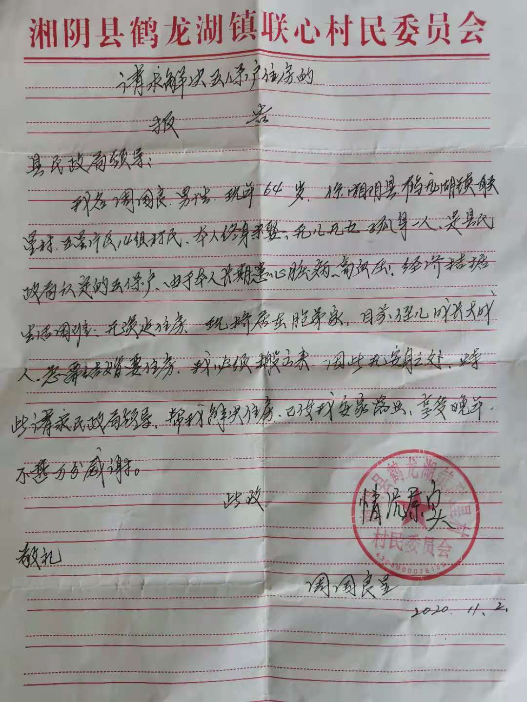 尊敬的李镇江县长: 您好,我是鹤龙湖镇联星村村民(原五星村14组1号),今年是决胜全面小康和决战脱贫攻坚的收官之年,大家都热情似火全力以赴为奔小康而努力,而今年我却面对一个着实难题,我今年31岁到了成家的年纪,现有一个伯伯今年64岁,无儿无女,五保户,无固定住房,寄住我家,长期患有心脏病,高血压,百善孝为先,作为他唯一的侄子面对6旬老人也无法将其赶出,但新婚房改造又不得不将伯伯暂住之地拆除,自己也有父母亲,房间局促,对此我多次找到村委领导而无法解决,实属无奈,冒昧来信,恳求您百忙之中关注解决,让孤寡老人安享晚年,以上情况确定真实 附上村委会真实认定证明 来信人:周鑫 2020年11月11日 |