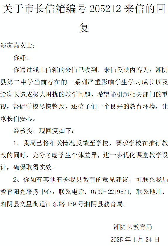 我要向您反映湘阴县第二中学当前存在的一系列严重影响学生学习成长以及给家长造成极大困扰的教学问题,希望能引起相关部门的重视,督促学校尽快整改,还孩子们一个良好的教育环境,让家长们安心。