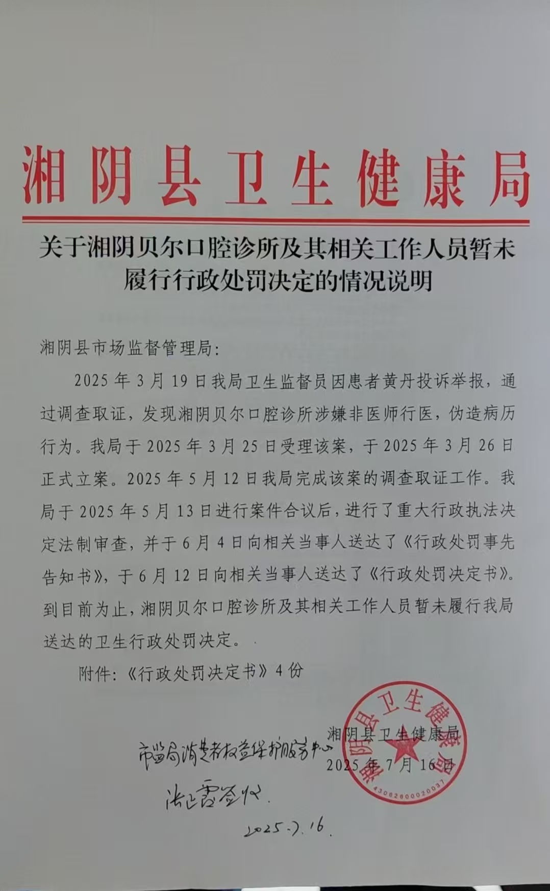 黄丹同志: 您通过线上信箱的来信已收到。 经核实,现回复如下: 1、我局近年来对医疗机构监管执法情况 自2022年起,我局在对全县医疗机构的监督执法工作中,共计监督检查1363家次,发现问题264起,共计立案176起,截止目前结案165起,未结案的其中有4起案件已向湘阴县人民法院申请强制执行。 2、我局对湘阴贝尔口腔诊所的处罚情况 自2025年3月9日我局接到您的举报,3月26日对湘阴贝尔口腔诊所立案起,先后对湘阴贝尔口腔诊所及其相关工作人员下达了《行政处罚决定书》4份。 3、黄丹与湘阴贝尔口腔诊所医疗纠纷一事的处理情况 我局自2025年3月9日接到您的投诉举报件后,先后多次与医患双方进行沟通,明确告知处理医疗纠纷的相关途径。积极组织医患双方进行协调处理,包括我局工作人员到岳阳与您见面进行现场调解和县医疗纠纷人民调解委员会准备进行第三方人民调解。目前,湘阴贝尔口腔诊所先后提出两个解决方案:一是您后期的口腔治疗费用(治疗医院为湘雅医院)由湘阴贝尔口腔诊所负责,并补偿您的交通费、营养费、误工费等费用共38000元;二是一次性补偿您80000元。我局工作人员到岳阳与您见面反复询问具体诉求,到目前为止您一直未回复我局工作人员,并且我局工作人员两次跟您联系,均未接听电话,也未做任何回复。县医疗纠纷人民调解委员会工作人员与您沟通,在湘阴贝尔口腔诊所申请调解,您同意调解的前提下,通知参加第三方人民调解,但您表示没有时间,县医疗纠纷人民调解委员会工作人员现还在等候您确定具体调解时间。您如不接受医疗纠纷人民调解委员会调解,建议您走相关司法途径维护自身合法权益。 4、你如有其他关于卫生健康的政策咨询需求,可联系我局信访室,联系电话:0730-2607898;联系地址:湘阴县文星街道东茅路卫生健康局三楼304办公室。 湘阴县卫生健康局 2025年7月28日 |