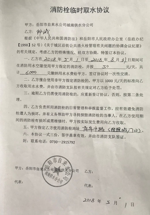 收到您的举报来信后,我公司十分重视,第一时间派稽查人员进行了核实,确认“青年中路理想城”相关人员及单位已与我公司签订了从2018年5月1日至2018年8月31日的《消防栓临时取水协议》,不属于违章用水。