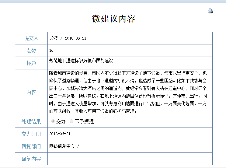 岳阳市政协委员吴波(139*******18)通过省政协云APP反映:随着城市建设的发展,市区内不少道路下方建设了地下通道,使市民出行更安全,也确保了道路畅通。但由于地下通道内标识不清,也造成了一些困惑。比如市政协与会展中心,东城港湾大酒店之间的通道内,就经常会看到有人站在通道中心,面对四个出口一筹莫展,所以建议,在地下通道内醒目位置设置提示标识,方便市民出行。同时,由于通道人流量增加,可以考虑利用墙面进行广告招租,一方面美化墙面,一方面可以创收,其收入可用于通道的维护与管理。