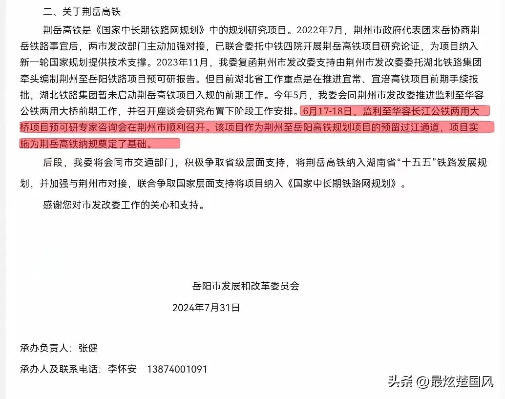 结合附件里岳阳发改委对荆岳高铁的回复,想问下现在荆岳高铁推荐方案是经过监利过江吗?现如今荆岳高铁进行到哪一步了?啥时候能开工?