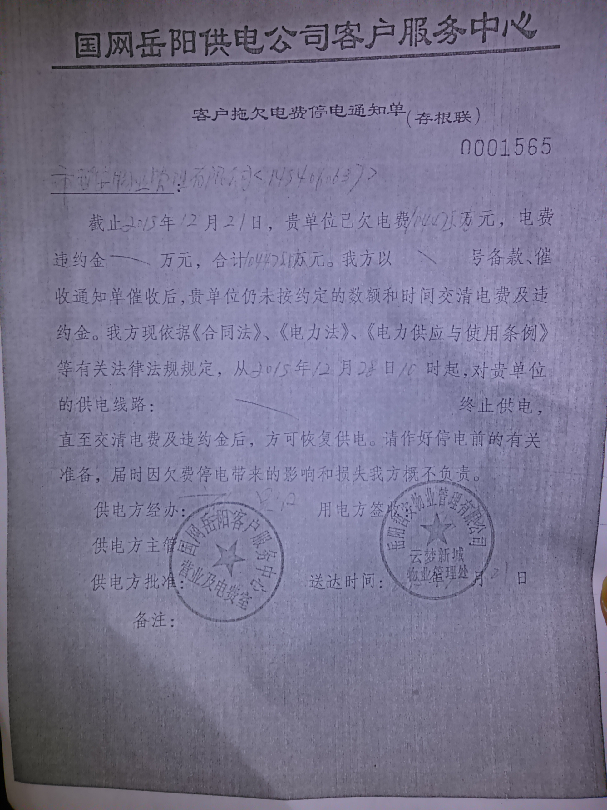 现,本人为云梦新城居民向市长信箱求助,要求国网岳阳供电公司使用合法合理的途径向哲安物业追讨所欠电费,并恢复全小区供电,使群众有水可用!理由如下:1,如附件照片所示,我们可知,拖欠国网岳阳供电公司电费和违约金的单位是岳阳哲安物业管理有限公司,我们支持国网公司以合理合法的途径和手段向哲安物业追讨欠款,但绝不是此种将风险、将压力转嫁给普通百姓的方式!2,小区物业公司拖欠了国网电费,国网岳阳供电公司有权对小区终止供电,然全小区近千户居民没有拖欠自来水公司毫厘,请问国网岳阳供电公司,你凭什么剥夺人民合法的用水权利!3,国网岳阳供电公司使用合法的途径追缴欠费,我们欢迎我们赞成,但是国网,请你有能耐停我们电,你也得有这能耐别影响我们用水啊!!