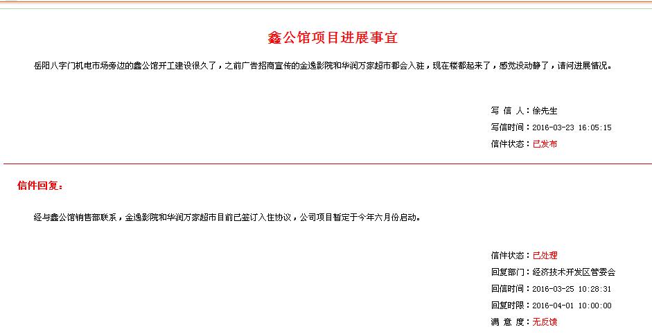 | 回复内容: | 网友你好! 联系项目业主单位目前鑫公馆已签订项目招商入驻协议,因投资方在核定其投资前景核算,待投资方股东会议后,启动装修运营。 特此回复 |