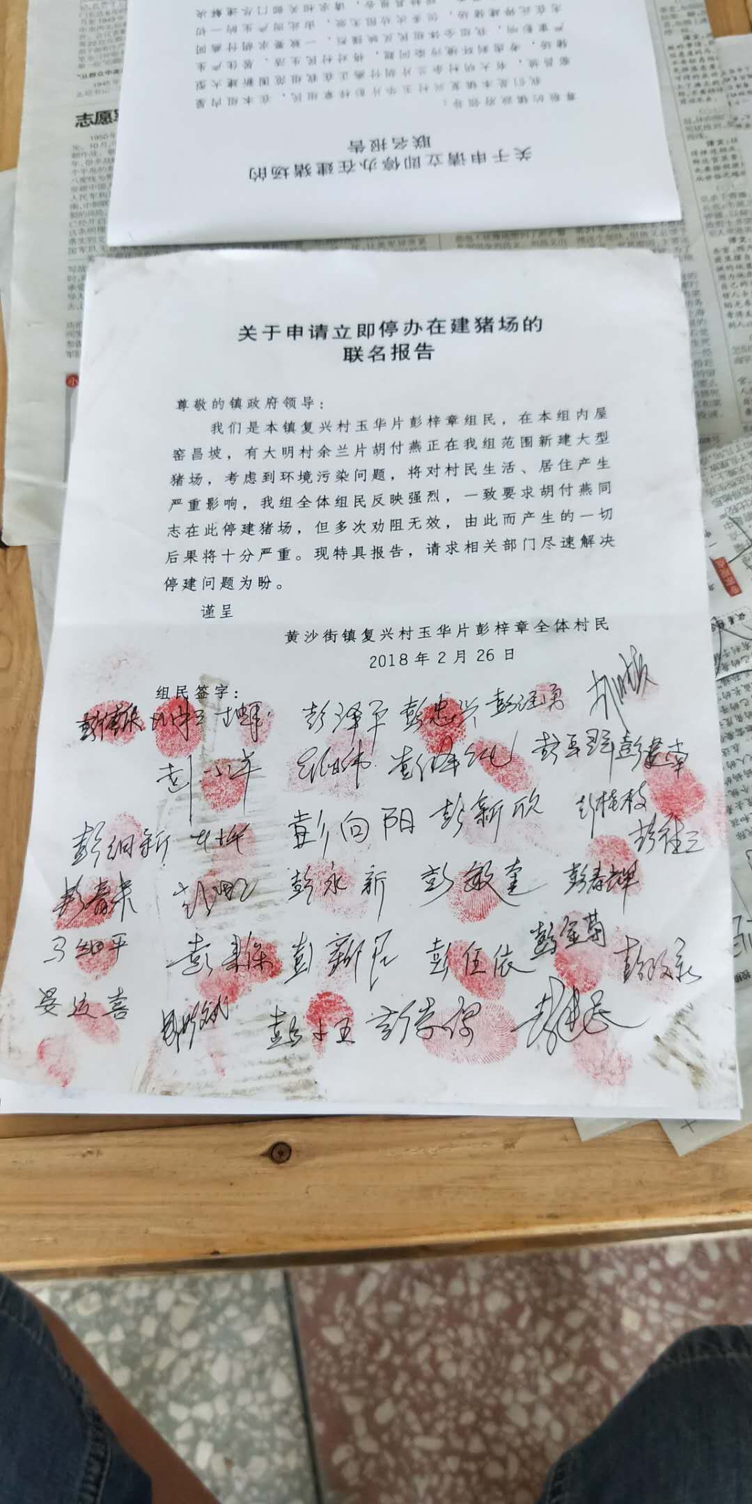 岳阳县政府: 兹有余兰村村民胡付燕在黄沙街玉华村二组居民居住处上游三、四百米处违法私自建设猪场,不顾全体村民反对,强行铲山头八亩多,极大的破坏我村环境及地貌,给我村居民带来了极大的环境污染问题,希望相关单位给我村全体居民做主,还我村民良好的生活环境。现有反对村民联名请愿书,望相关单位予以重视。 玉华村全体居民 |