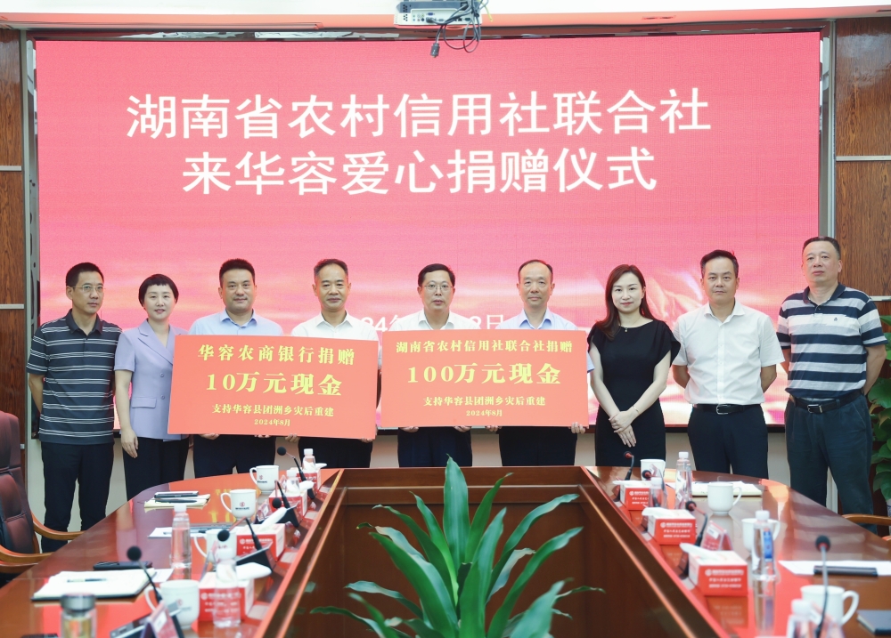 华容融媒体中心讯(记者 刘神尊 董华杰)8月22日,湖南省农信联社、华容农商银行分别向华容县捐赠了100万元和10万元现金,用于支持团洲乡灾后重建,湖南省农信联社委委员、副主任刘浩,华容县委书记陶伟军,县委常委、县委办主任胡军,县人民政府副县长毛彦景以及华容农商行负责人一同参加捐赠仪式。
